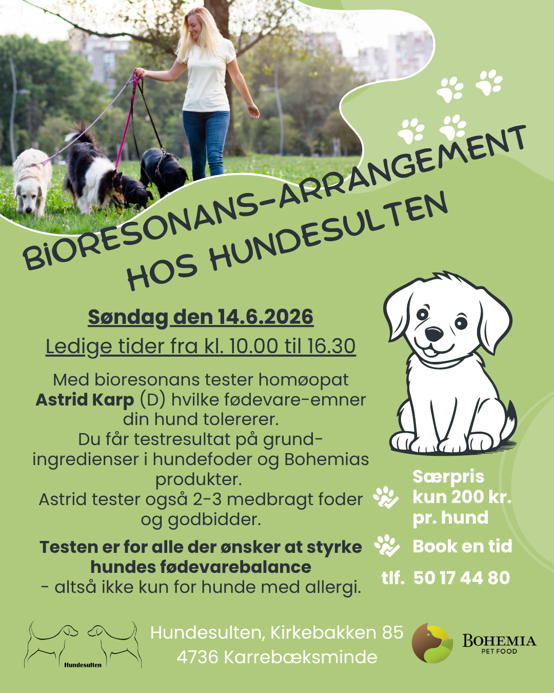 Astrid kan med bioresonans teste en hund for hvilke fødeemner den kan gøre brug af, samt godbider, tørfoder, dåsemad og diverse tilskud - kort sagt alt hvad man putter i munden på sin hund. En hund behøver ikke at være allergiker for ikke at kunne gør brug af sit foder.