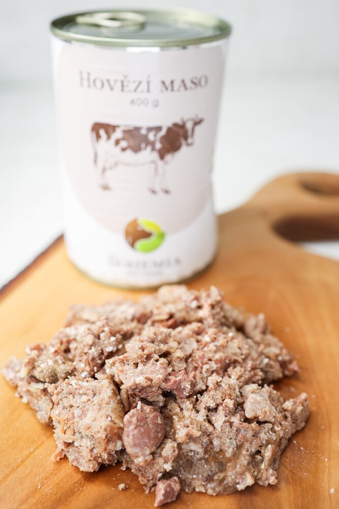 En unik type oksekød fra Angus-kvægracen fra det nordlige Skotland. Dåsen opfylder standarden "single protein", hvilket betyder, at den kun indeholder én type protein - oksekød. Den indeholder også kun grøntsagsbouillon og koldpresset hørfrøolie.