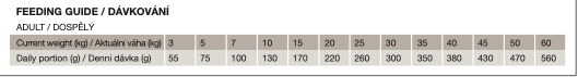 Server foderet tørt eller med vand. Giv din hund den daglige ration i forhold til hundens vægt. Den anbefalede daglige ration er kun vejledende. Mængden af dagligt foder afhænger af hundens foderstand og alder. Hvis hunden er overvægtig, ældre eller inaktiv, skal den daglige portion reduceres med op til 10%. Hvis hunden er undervægtig, meget aktiv eller unghund, skal den daglige portion øges med 10%. Hundens foderstand skal vurderes ofte og fodermænden justeres herefter. Rent, frisk vand skal altid være tilgængeligt. Foderet skal opbevares tørt.