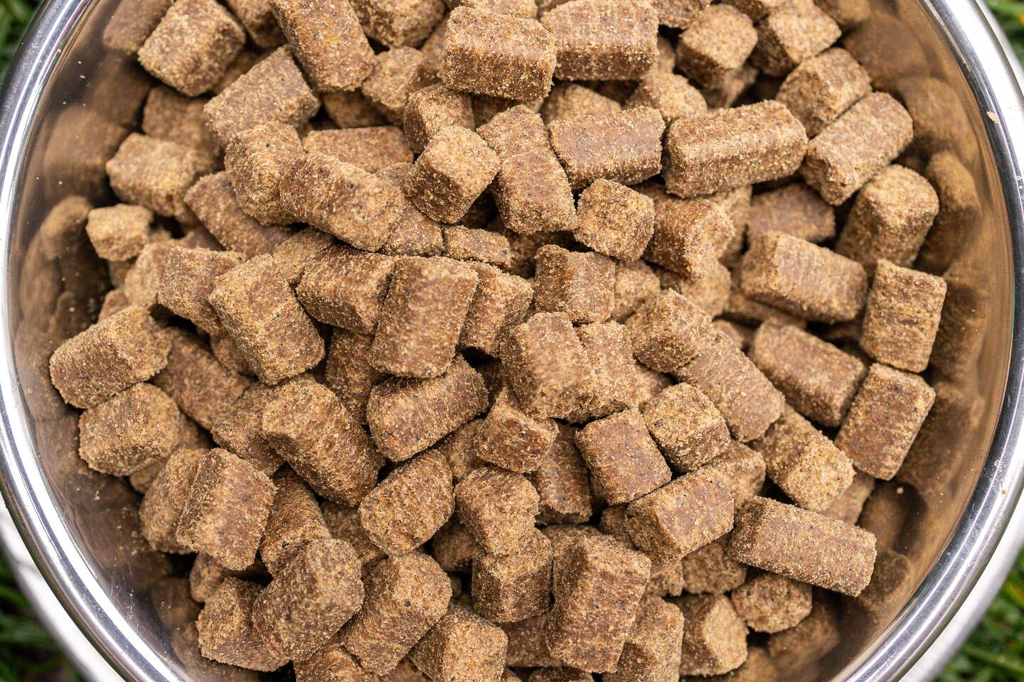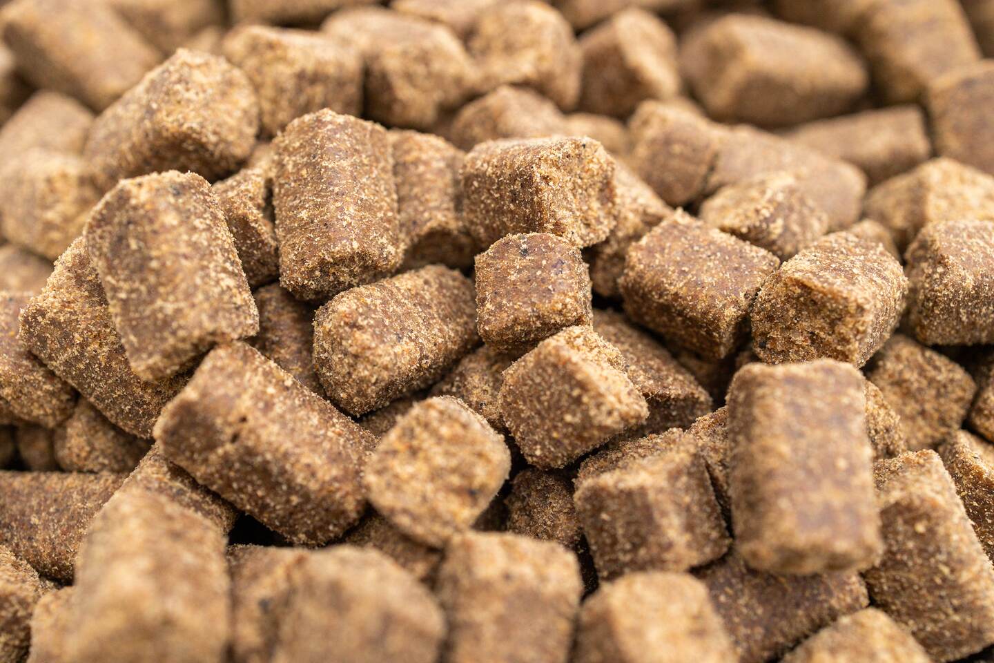 KOLDPRESSET HUNDEFODER til voksne hunde, skånsomt fremstillet ved lave temperaturer.